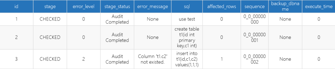 从返回结果可以看到,每一行语句的审核及执行信息,最前面打印的是field_names,表示Inception的返回结果集的列名信息,总共包括十个列,下面是每个列对应的结果