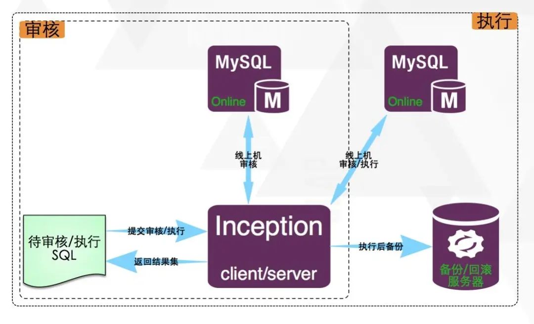 Inception是一个集审核、执行、备份及生成回滚语句于一身的MySQL运维工具,通过对执行SQL的语法解析,返回基于自定义规则的审核结果,并提供执行和备份及生成回滚语句的功能。Inception工作模式和MySQL完全相同,可以直接使用MySQL客户端来连接,但不需要验证权限,它相对应用程序(上层审核流程系统等)而言,是一个服务器,在连接时需要指定服务器地址及Inception服务器的端口即可,而它相对要审核或执行的语句所对应的线上MySQL服务器来说,是一个客户端,它在内部需要实时的连接数据库服务器来获取所需要的信息,或者直接在在线上执行相应的语句及获取binlog等,Inception就是一个中间性质的服务。