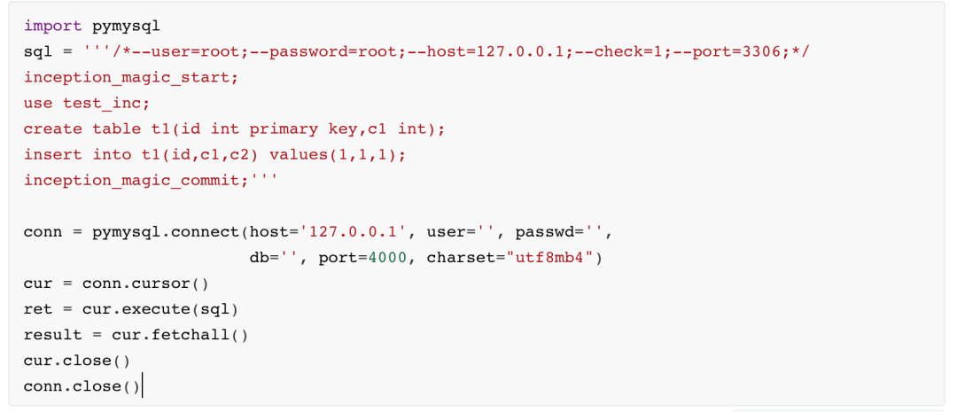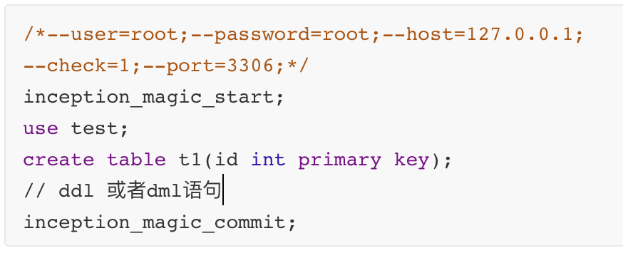 请不要将下面的SQL语句块,放到MySQL客户端中执行,因为这是一个自动化运维工具,如果使用交互式的命令行来使用的话没有意义,只能是通过写程序来访问Inception服务器。