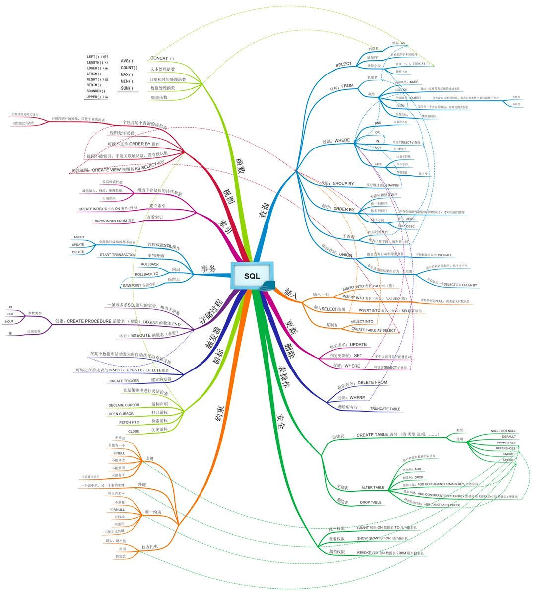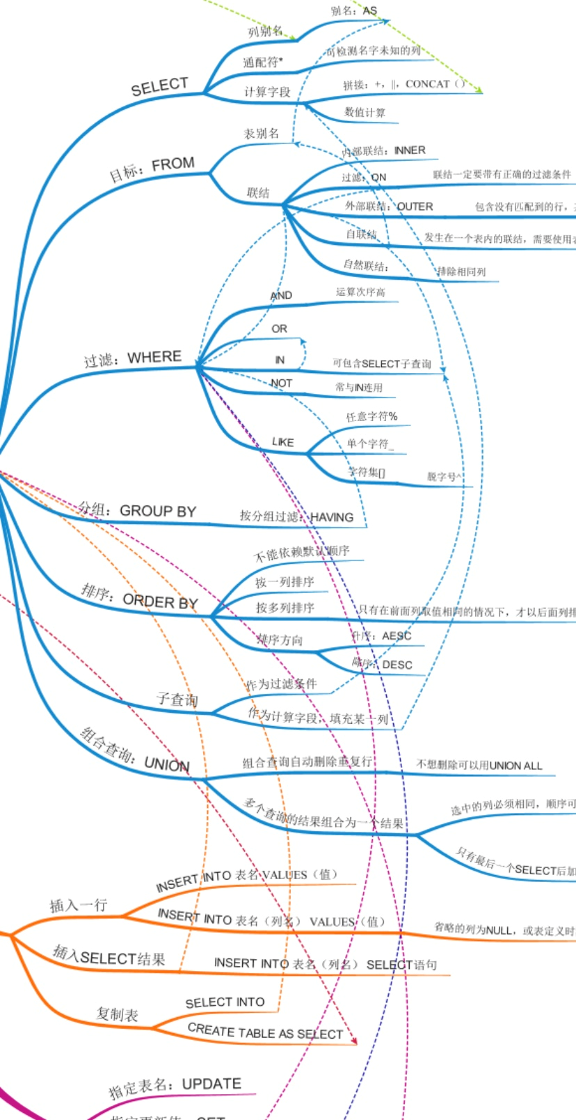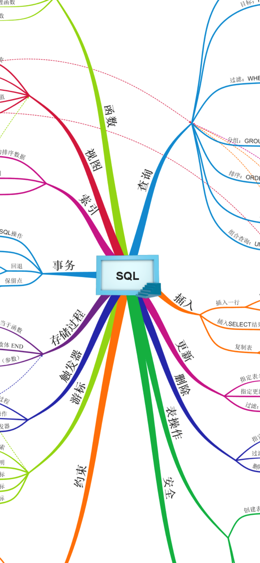 每个知识章节都用不同的颜色标注出来,对不同的SQL知识可以进行分类。