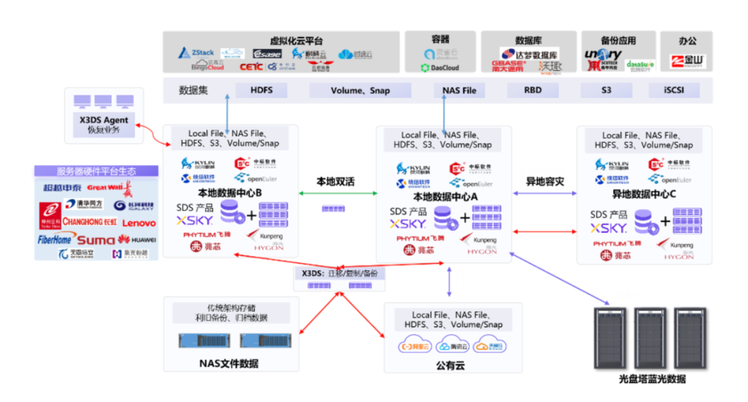 可无缝对接信创生态的虚拟化云平台,容器,数据库,备份,办公等应用,满足本地到跨集群的数据容灾、迁移、备份,以及双活,两地三中心,海量非结构化数据一体化高速访问和长期存放等全业务需求。