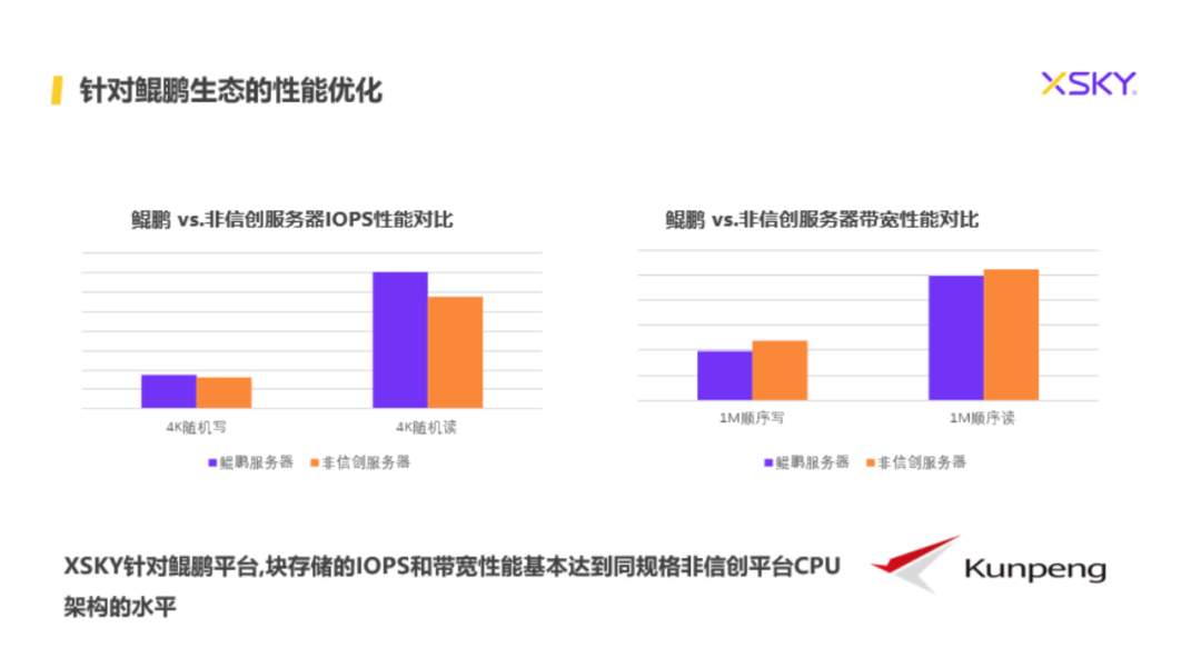 通过XSKY的调优,天合翔宇的性能相比主流的开源软件定义存储系统,获得数倍的提升。根据XSKY内部实验室测试数据显示,在鲲鹏生态下,天合翔宇4K随机读、写IOPS三倍于主流的开源软件定义存储系统,1M顺序读、写的带宽性能则提升近2倍。