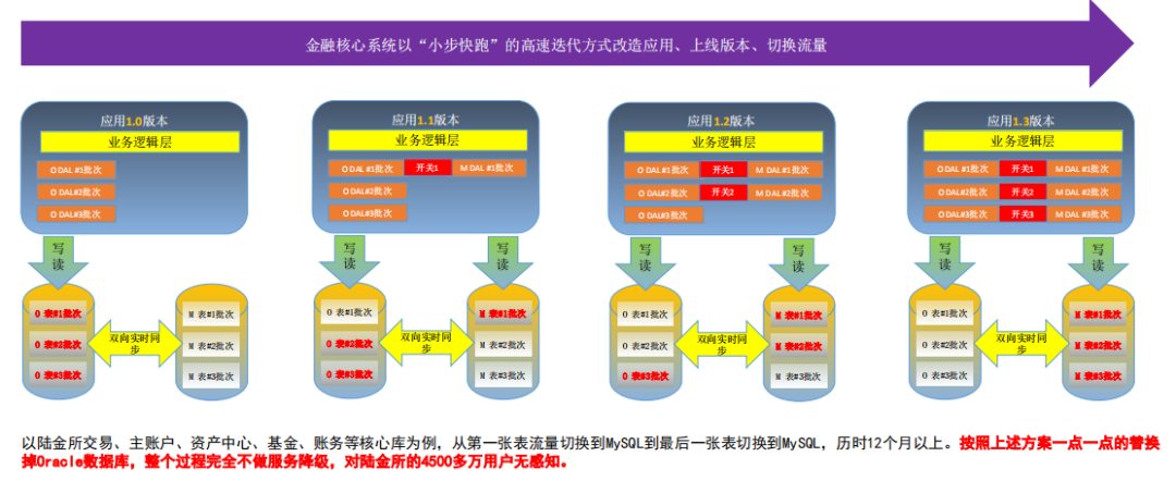 按照这个维度一点点地进行拆分,只要这张表要上线和切换,我们在后台完全建立起这套同步机制之后,就等待应用上线完成。从应用1.0版本到1.1、1.2,最后到应用1.3的版本,应用不断迭代发版。