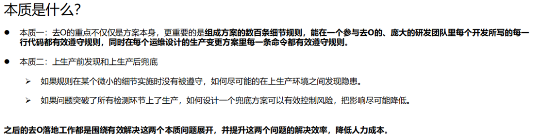 接下来分享的是大家在去O过程中的一个痛点:我们对大规模的系统进行去O改造,到底要从哪里入手?怎么做才能将系统风险降到最低而且全程可控?