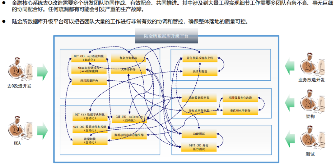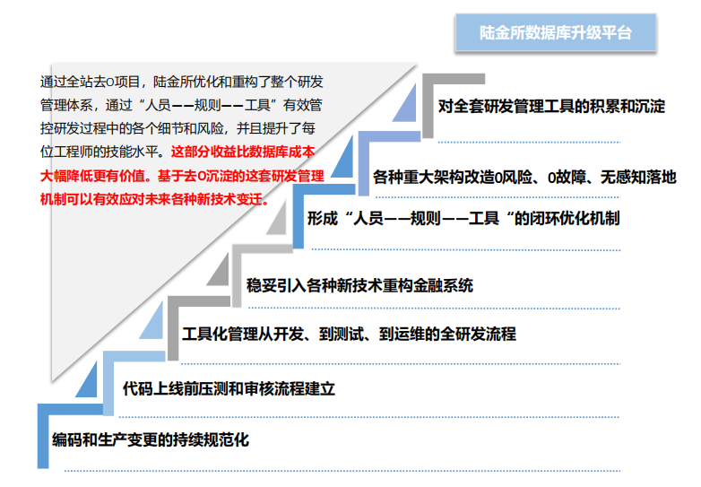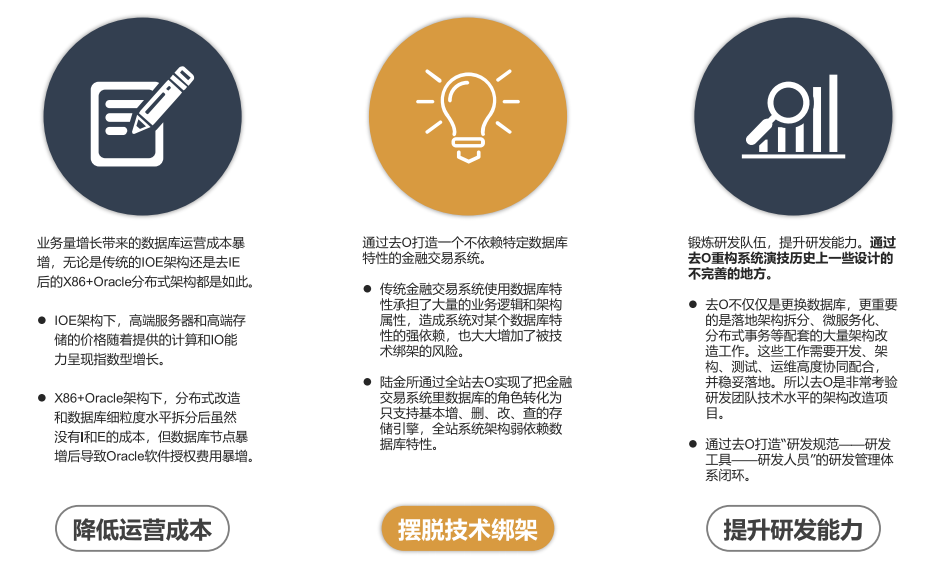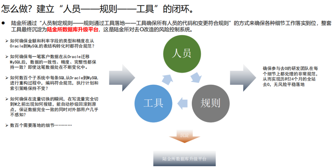 稳妥:把一个非常大的系统拆分成上百层次,再一点一点把数据库替换掉,全程实现0故障、0风险。在过去两年,陆金所没有因为去O而引发任何生产事故,所以说这一块在考验团队研发能力的同时也考验去O落地工具的设计和研发水平;