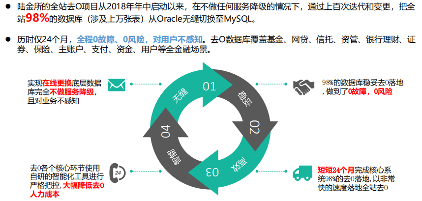 以陆金所为例,我们采用了这套框架来推进去O改造,我们很多核心系统的改造基本上花费12个月或以上,基本上一点点地把Oracle数据库给替换掉。并且整个过程是完全不做服务降级的,所以对陆金所4500万多用户来说几乎无感知。