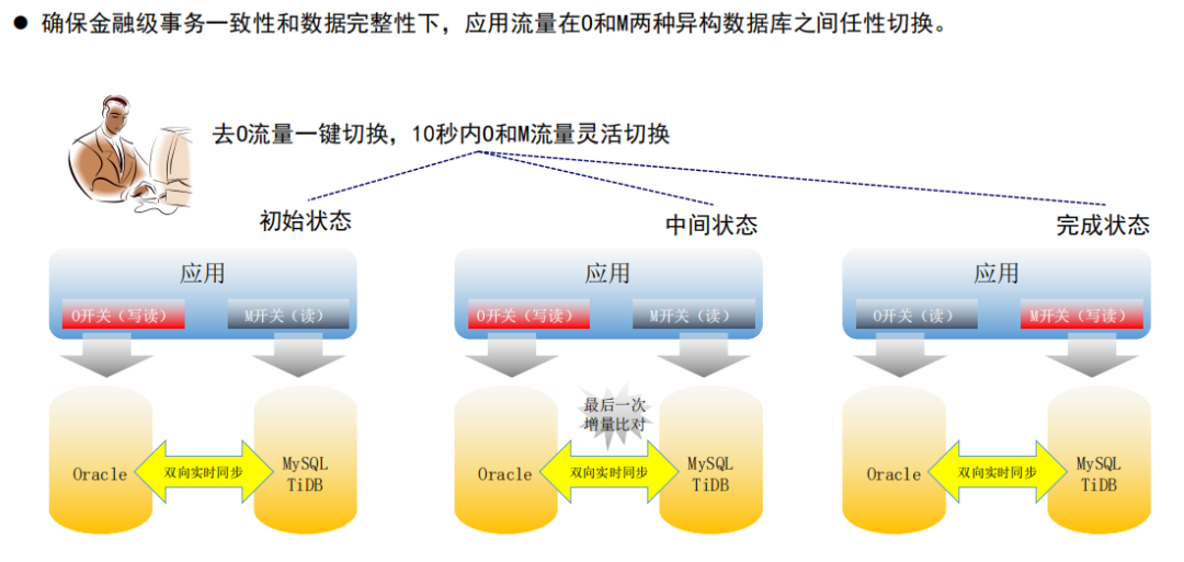 等待应用版本发布上线以后进行流量切换。其中设置了一个总控开关控制从应用到数据库,从到Oracle到MySQL数据同步的整个流向,从而进行全盘切换;