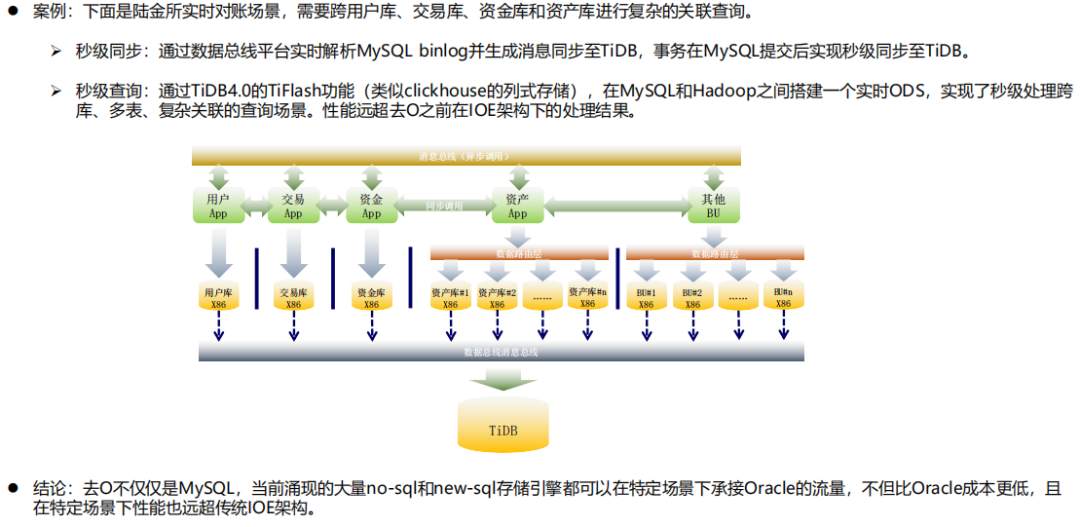 希望通过这次介绍能让大家更深入地了解,一个金融系统要把Oracle这种商业数据库去掉会碰到的难点和风险,并且给想去O但是又不敢落地实施的同学提供一些案例实战解决的思路和方法。