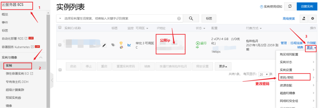 1.2 获取公网IP,更改密码(第一次需要重启)