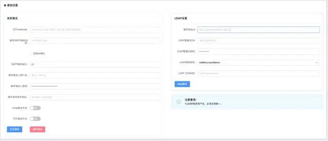 设置消息推送相关信息 包括钉钉机器人/email,设置LDAP相关信息,全局配置信息,全局配置开关