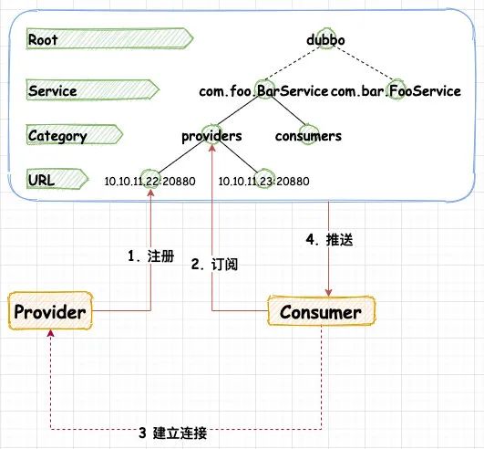 其中 「Root」 层是注册中心分组,默认命名为 dubbo。我们可以通过修改 <dubbo:registry>