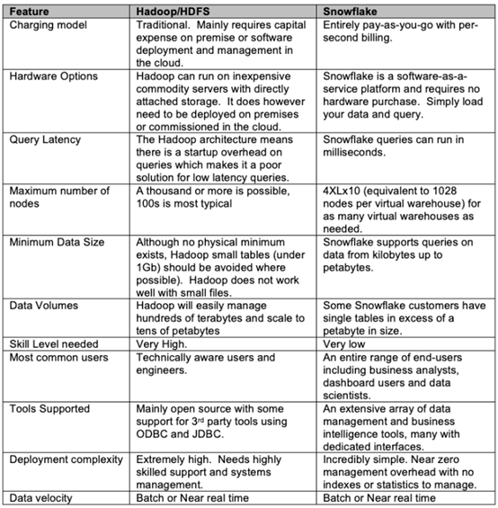 下表对Hadoop和Snowflake的主要功能进行了简单的并排比较: