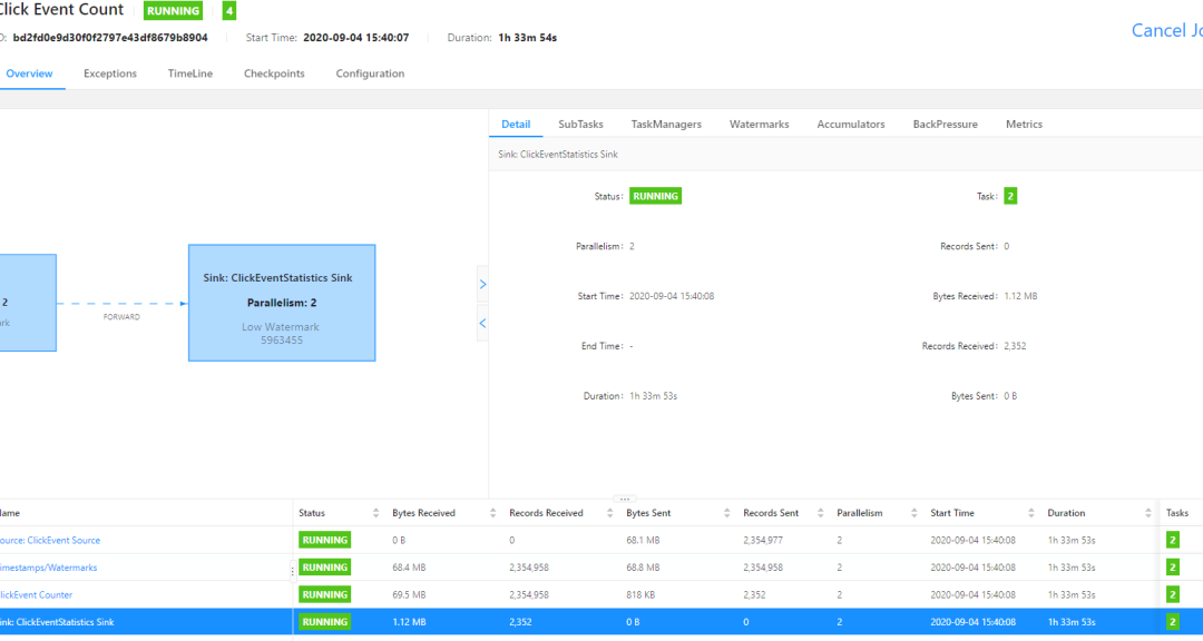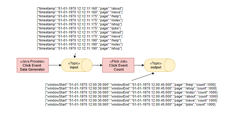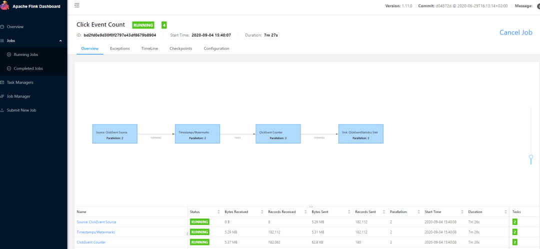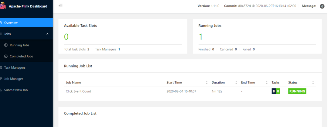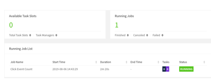 启动时,名为Flink Event Count的Flink作业将提交给JobManager。此外,还将创建两个Kafka Topics 输入和输出。