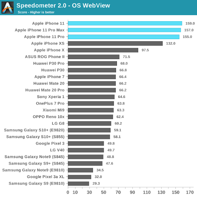 或许会出现像手机行业那样的结局。Anandtech 的 iPhone 11 评测对最新的旗舰手机进行了 Web 性能基准测试。从顶端开始,是苹果手机、上一代苹果手机、前两代苹果手机,然后是其他手机。而且,他们确实提到了 iPhone 11 具备了桌面级芯片的基准性能。