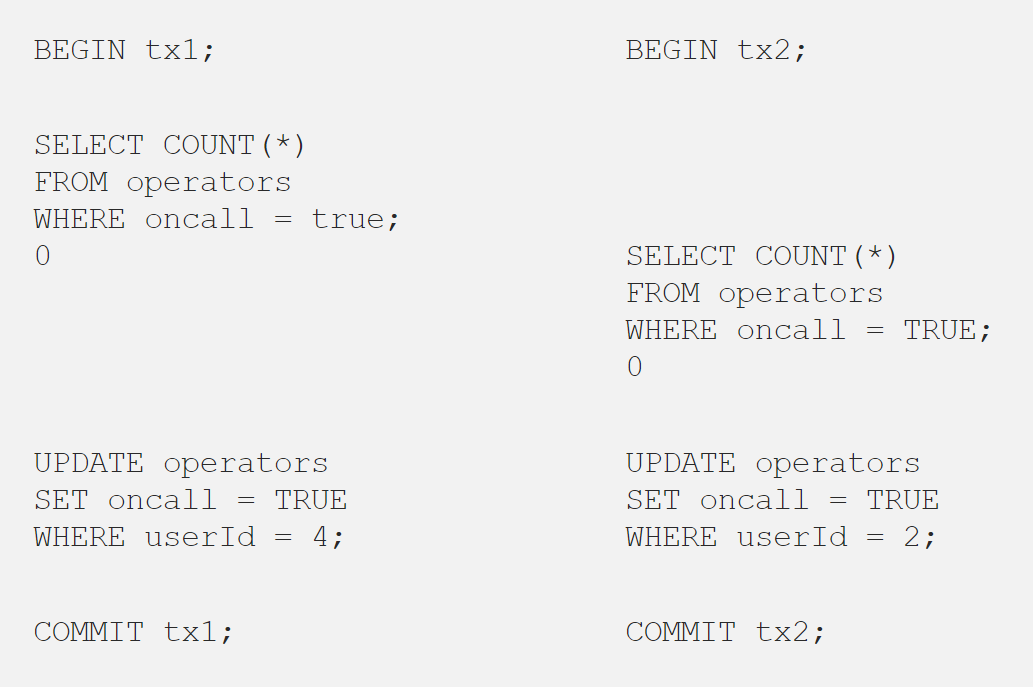 对于上述情况,如果两个事务成功提交,就会出现写倾斜。即使没有发生脏读或数据丢失,数据的完整性也会丢失,因为有两个人被指派随叫随到。
