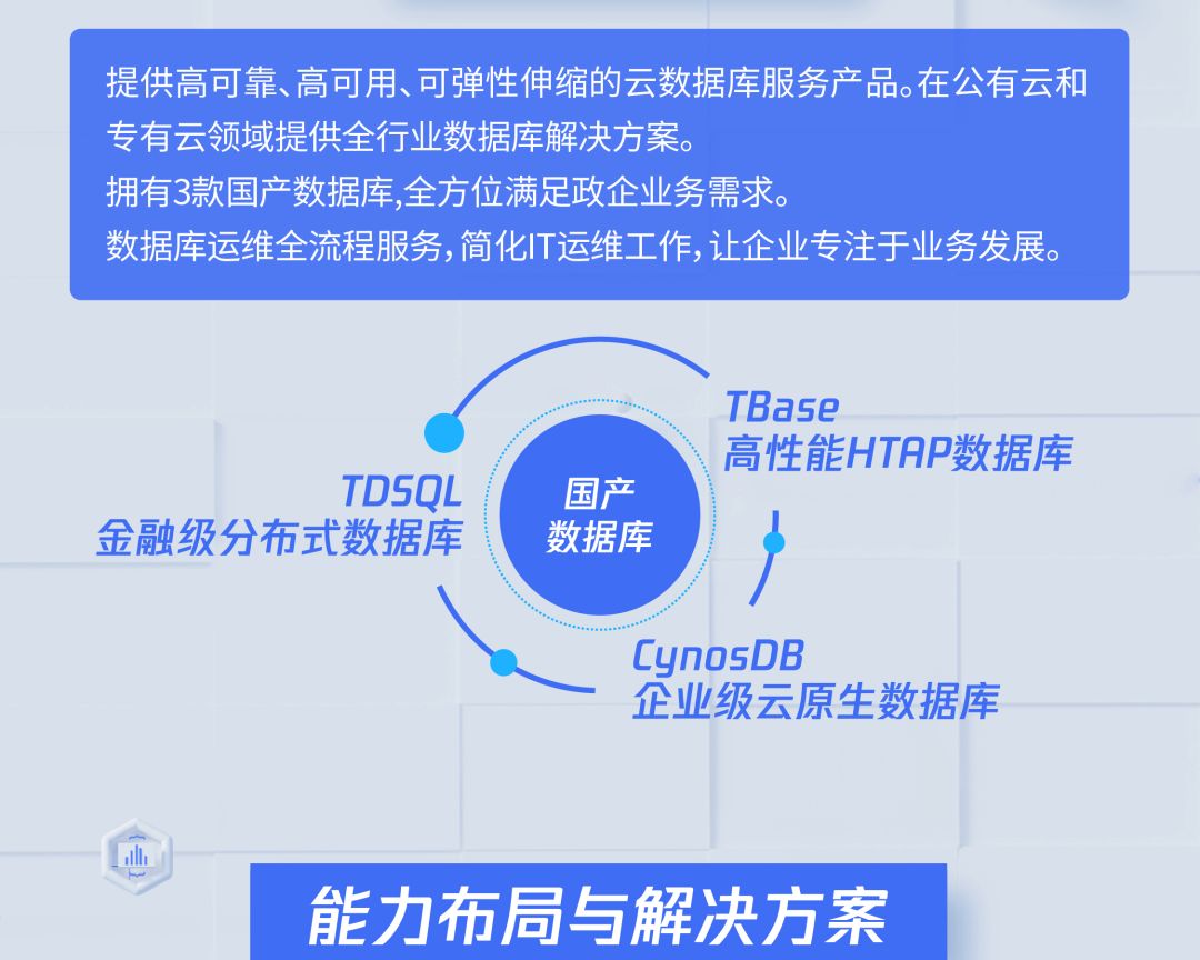 腾讯云数据库目前已经形成了一套完整的数据库整体解决方案,可以提供主流的MySQL、Redis,自研数据库CynosDB、TDSQL、TBase等近20款数据库PaaS产品,以及迁移上云服务、运维智能监控、数据库智能管家DBbrain等多款SaaS产品,为金融、保险、政府、电商、游戏等行业客户上云提供完善的数据库产品保障。
