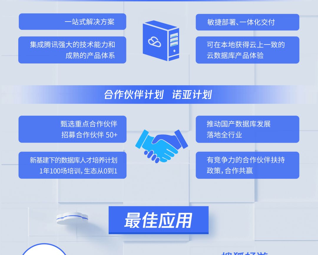 此外,腾讯云数据库还推出“诺亚计划”,基于该项目腾讯云将招募超过50个重点合作伙伴进行核心培养,每年提供超过100场定向培训,推动国产数据库生态全面发展。未来,腾讯云将以更有竞争力的合作伙伴政策实现合作共赢,携手共建生态,推动国产数据库发展并落地全行业。