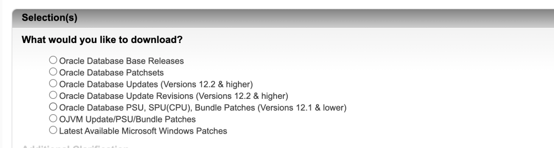 可以参考《Assistant:Download Reference for Oracle Database/GI Update, Revision, PSU,SPU(CPU), Bundle Patches, Patchsets and Base Releases (Doc ID2118136.2)》来下载补丁集,打开的页面中,我们可以选择下载db的基础版本,db补丁集和ojvm的补丁集等。