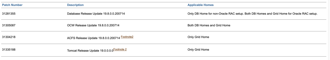 下图是基于19c版本今年7月份发布的19.8的补丁集。DatabaseUpdate只包含db补丁包,GIUpdate则既包含GI的补丁包也包含db的补丁包,具体的可以按需来进行下载。