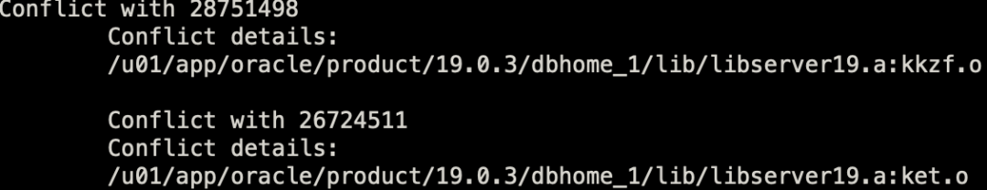 这里的冲突可以是小补丁和小补丁之间的冲突,也可以是小补丁和补丁集之间的冲突。有2个解决思路,一个是提SR申请冲突小补丁的merge补丁,这个等待时间可能比较久。另外一个思路,就是更打较新的补丁集,一般最新发布的补丁集都会包含之前小补丁,那这块就需要拿补丁集去确认了。