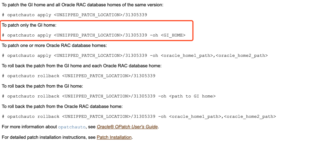 使用opatchauto命令去更打补丁,一般GI和DB都分开更打。可以根据readme中提供命令进行补全(如下图),整合出适合自己环境的命令。