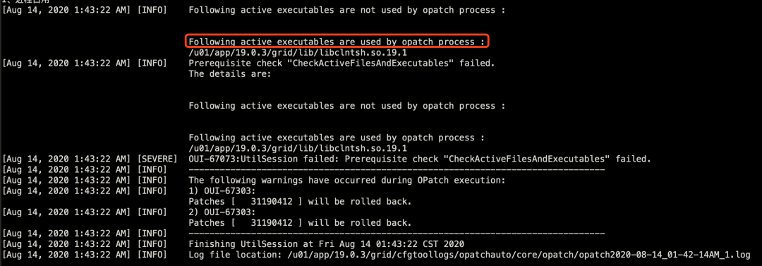 其实做好前期准备工作,基本是成功的几率就很高了,如果还有报错,可能就是遇到bug或者其他问题了。那就只能临时去找解决方案了,如果最终拖的时间比较长,维护窗口时间有限,最后也就只能回退了。分享2个简单报错示例:下图是一个进程占用报错的示例,可以通过fuser命令来确认占用进程,kill掉就行: