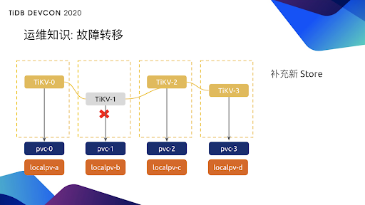 那 Operator 有了这些知识并且把它代码化之后,就可以在检测到异常后,过一段合理的时间后再补充新的 store ,把副本数补齐。这样即使我们接下来 TiKV2 再挂,那集群就不会受影响,这就是 Operator 帮助我们做的故障转移。