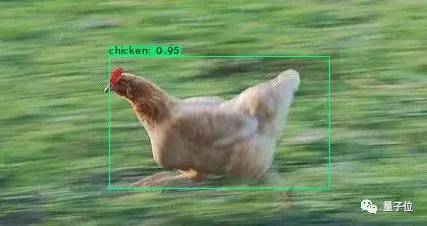 下图是一只快速跑动的动物,可以看见,算法预测这只动物为鸡(chicken)的概率是95%。