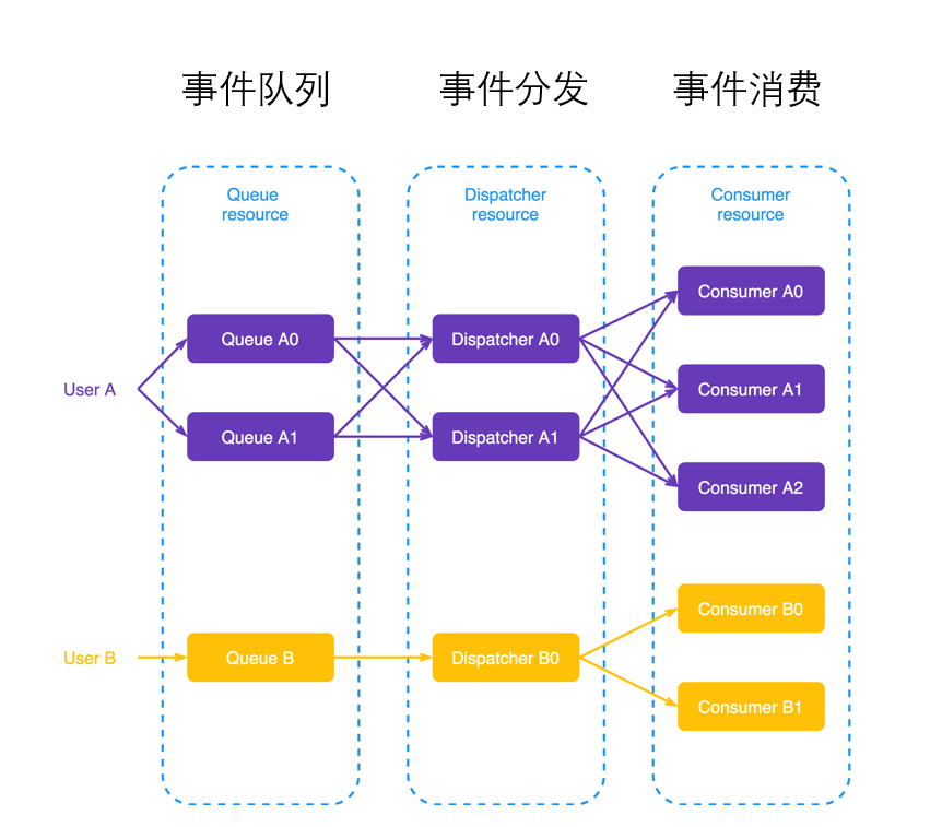 下图展示的是函数计算对事件的异步处理,其处理流水线主要包括事件队列、事件分发、事件消费三个环节,在每一个环节上都可以进行水平伸缩,其中一个比较关键的点是事件的分发需要匹配下游的消费能力。另外,通过为不同函数指定不同数量的计算资源,用户能方便地动态调整不同类型事件的消费速度。此外,还可以自定义错误重试逻辑,并且有背压反馈和流控,不会在短时间内产生大量请求时压垮下一个服务。