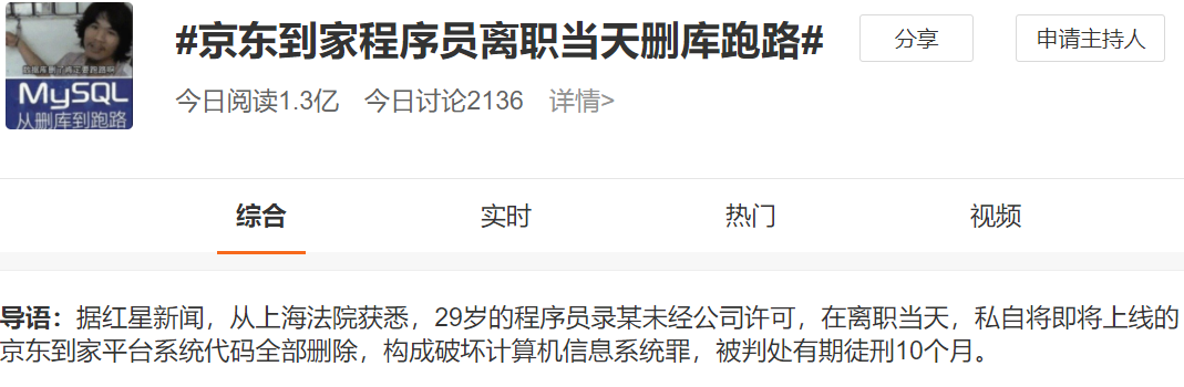 又一程序员“删库跑路”被判刑了。近日,一则关于#京东到家程序员离职当天删库跑路#的消息冲上热搜榜榜单,一度引发网友们的广泛关注。对此,有网友表示:“删库跑路”的段子一直在IT圈里广为流传,删库一时爽,后果很严重”。