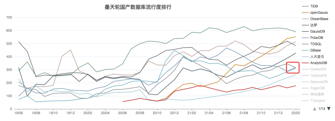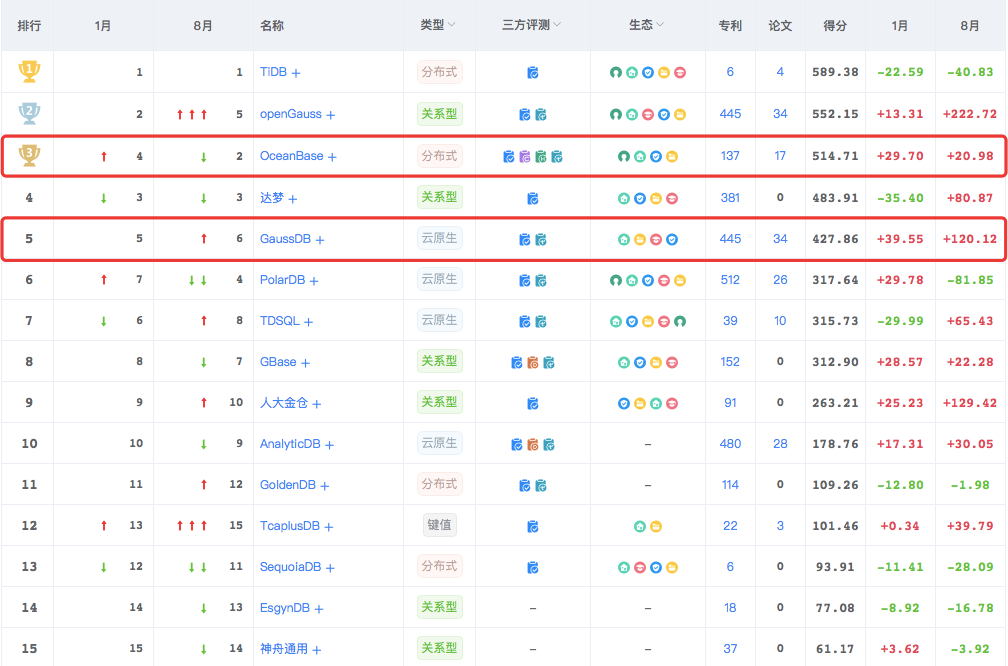 openGauss分数继续保持上涨,本月总分552.15,比上月增加13.31分,位于榜单第二位。1月份,openGauss保持在社区分享技术文章的习惯,增加用户粘性,提升流行度。OceanBase本月分数上涨29.70,实现“三连增”,总分达到514.71,超过达梦,重新夺得探花之位。本月OceanBase分数上涨离不开新版本的发布。1月6日,在DC2021分布式数据库开发者大会上,OceanBase CTO 杨传辉宣布 OceanBase 社区版 3.1.2 正式发布,并推出社区版工具体系,实现了可用性和易用性的双重飞跃。达梦分数下跌35.40,是本月分数下降最多的数据库,总分483.91,排名下降一位,位于榜单第四。近日,权威市场调研机构IDC发布的《2021年上半年中国关系型数据库软件市场跟踪报告》显示,在中国关系型数据库市场上,武汉达梦数据库股份有限公司2021上半年市场份额同比增速达229%,在国内外主流厂商中位列第1。在如此快的增速下,达梦未来的市场表现会不会带来惊喜,我们拭目以待。位于第五位的GaussDB是本月分数增长最多的数据库,上涨39.55,总分为427.86。笔者认为GaussDB本月分数上涨有以下几个个原因:第一,国际研究机构Gartner发布2021年全球云数据库魔力象限报告《Magic Quadrant for Cloud Database Management Systems》,华为云凭借GaussDB系列数据库产品入选魔力象限的特定领域者,展示了GaussDB在行业实力、亚太市场影响力、云产品组合和生态广度方面的优势。第二, 《2021年上半年中国关系型数据库软件市场跟踪报告》表明,华为云数据库凭借GaussDB以14.7%的份额占据本地部署市场国产数据库第一,市场占有率高。第三,1月21日,在墨天轮举办的“2022年新春发布会暨国产数据库年度颁奖典礼”上,GaussDB凭借2021年的优秀表现,荣获2021年度卓越表现数据库奖和2021年度云原生数据库,获得行业专家认可。第四,华为云参加第十一届PostgreSQL中国技术大会,多位数据库专家出席并分享了华为云数据库最新技术与实践,推动其知名度与流行度提升。接下来,GaussDB在产品性能、市场、品牌知名度上有何表现,流行度分数是否会继续增长,引人期待。PolarDB本月分数上涨29.78,总分317.64,名次上升一位,位于第六。1月份,PolarDB在墨天轮社区上传了多个技术文档,有效地拉动了其分数增长。TDSQL分数下降29.99,总分315.73,名次下降一位,排名第七。1月份,腾讯云TDSQL PG版(开源代号TBase)再升级:分布区表关联查询性能(join)提升超10倍,同时提升了产品在分布式场景下的易用性,增加灵活可用的功能组件。TDSQL PG开源版基本保持每月一次小升级、每半年一次重大升级的节奏,帮助众多开发者应用前沿数据库技术。GBase分数增长28.57,总分312.90,名次未变,排名第八。笔者看来,第一届“GBase技术文章”有奖征文大赛活动的开启和在第十一届PostgreSQL中国技术大会上的亮相是推动其分数增长的重要原因。