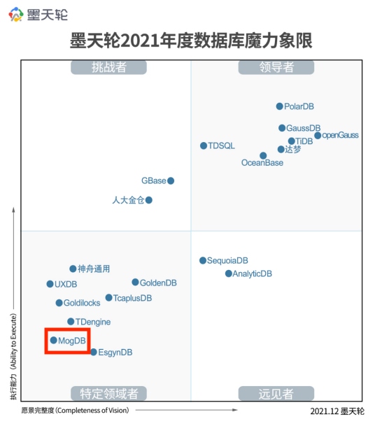 墨天轮选取2021年12月流行度排行前40的数据库产品,通过2021年平均分、最新得分、复合增长率、三方评测、生态以及论文和专利数量综合评定,同时参考了该数据库在 Gartner 全球云数据库魔力象限的表现以及 IDC 全球数据库市场份额报告。最后将数据汇总到两个维度上 — Ability to Execute和 Completeness of Vision ,根据各家供应商们的表现,将其划分入四个象限中,分别为:领导者、远见者、挑战者和特定领域者。