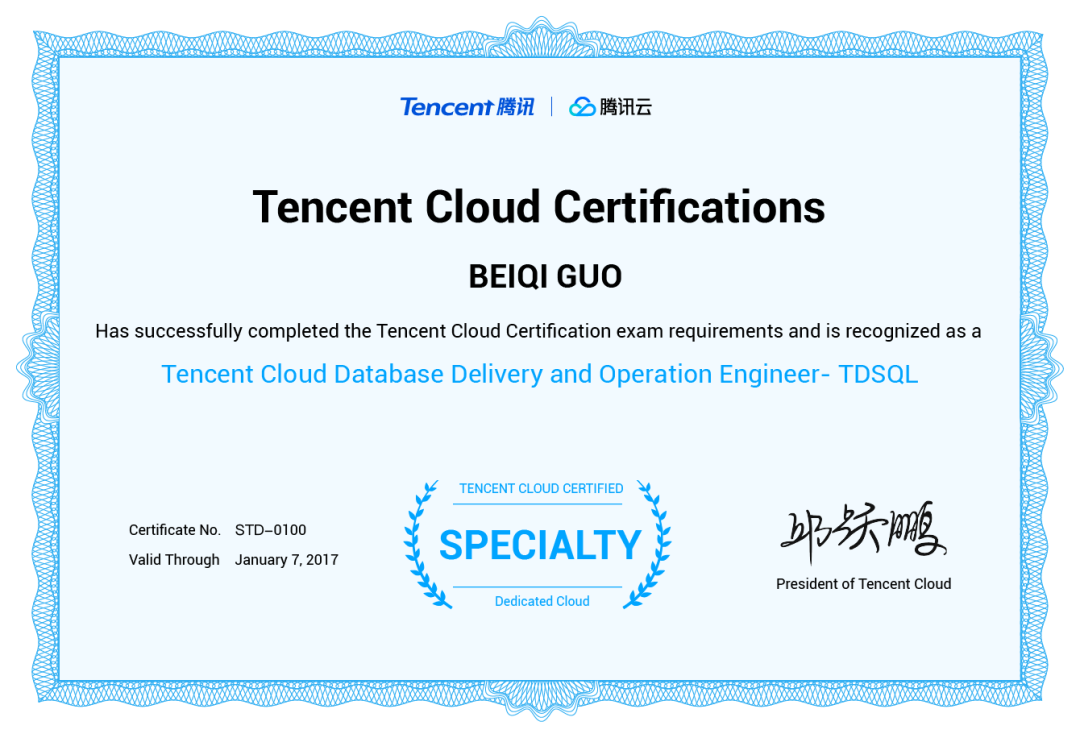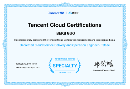 目前腾讯云共推出两款数据库培训认证,通过认证考试将获得由腾讯云发放的能力认证证书,证书有效期两年,证明自身技术实力;该证书支持企业通过输入您的姓名及认证编号进行查询,以辨真伪;同时您的信息也将被录入腾讯系优秀人才库,帮助您获得更多职场机会。
