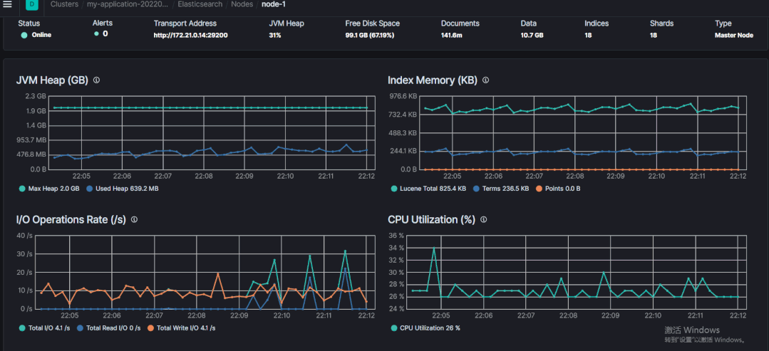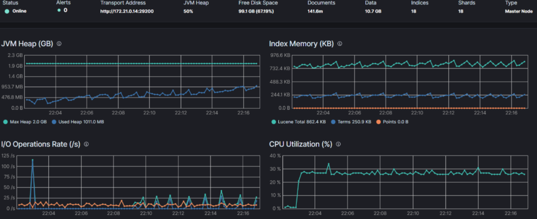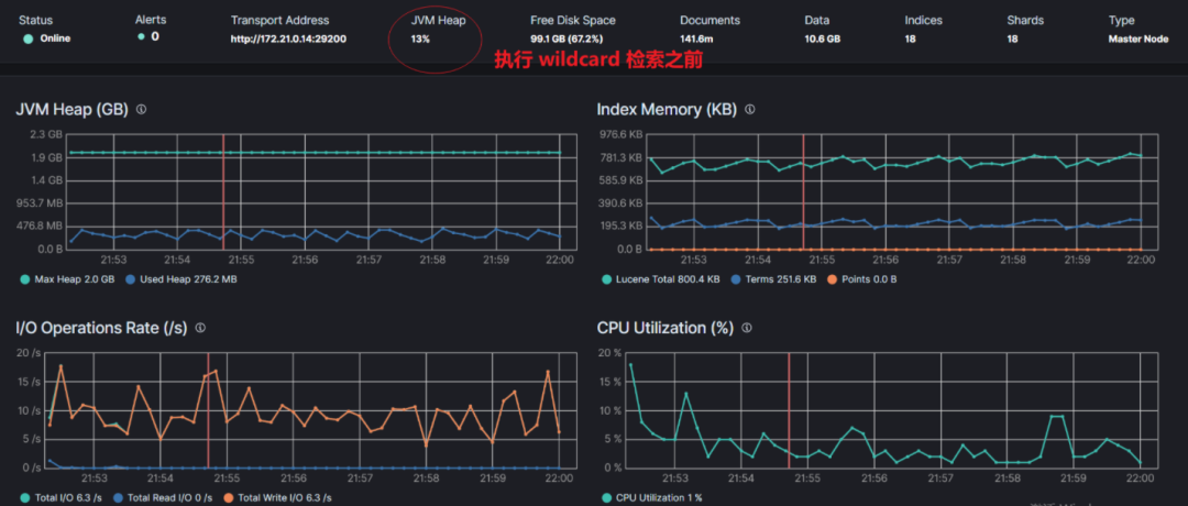 22:03 分左右开始的检索,下图是开始检索前的截图,JVM Heap 使用率 13%左右。