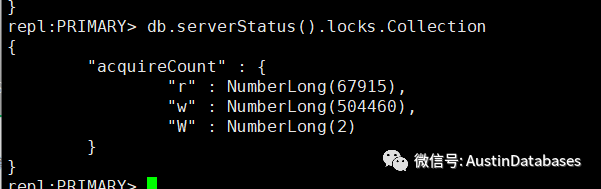 db.serverStatus().locks中可以获得database ,oplog ,以及 collection的locks 这里可以关注相关的collection 的数字的变动,如果有浮动有变化可以关注相关的collection 锁的增加的情况.