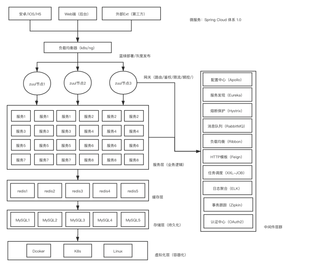 具体每个组件的作用就不在这里详细说明了,在这套架构方案里面,我们没有完全照搬 Spring Cloud 全家桶的组建,还是根据自己的需求对其中组件进行的更换。