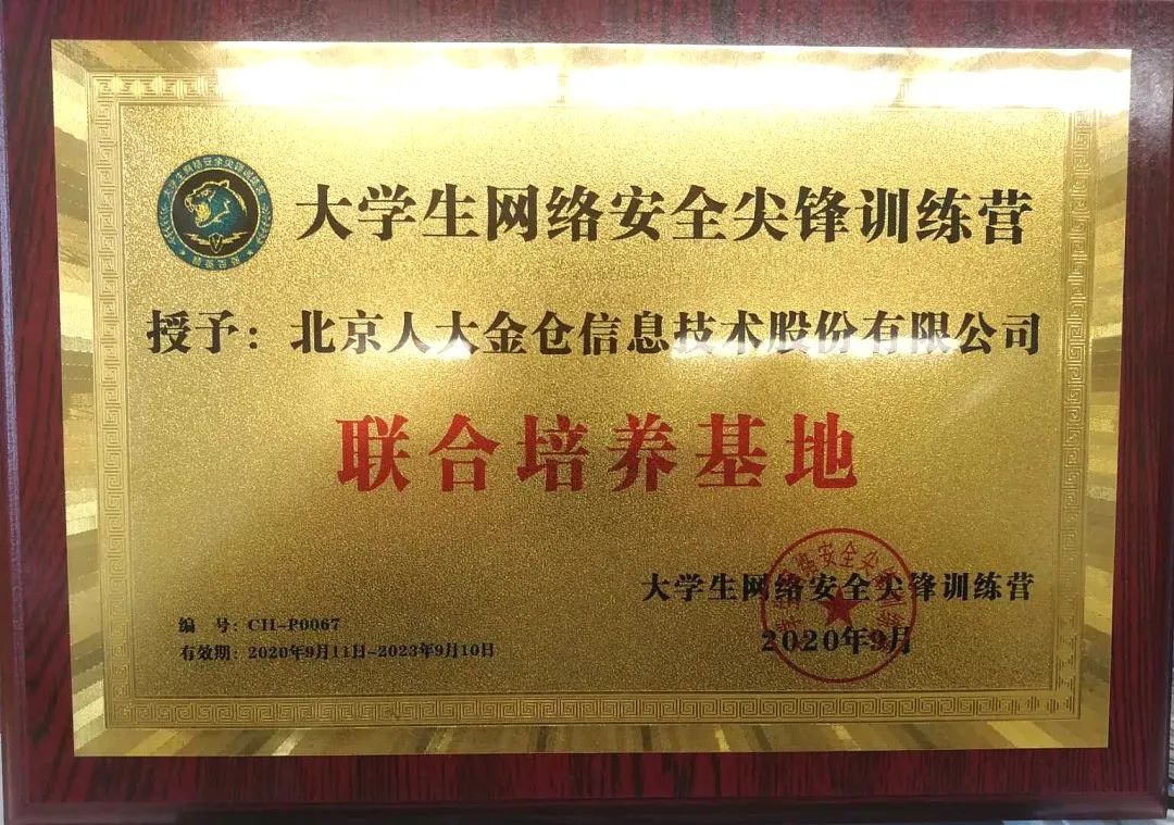 大学生网络安全尖锋训练营在论坛上为优秀联合培养基地进行了授牌,人大金仓成为唯一一家被授予“联合培养基地”殊荣的数据库企业,这是对人大金仓始终立足自主研发、产学研相结合的人才培养模式的高度认可和勉励。