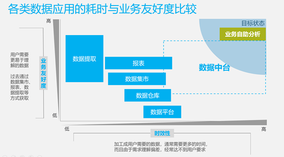 在我们传统的数据应用中,随着数据对于业务友好度的增加,其时效性也在减弱。而我们的目标,显然是数据又快又好。既然各部门的需求都不一样,为何不让业务自助分析数据呢?于是我们有了右上角的目标状态。但是这个理想状态和我们现在的数据应用中间有巨大的空隙,靠什么来填补?答案就是数据中台。