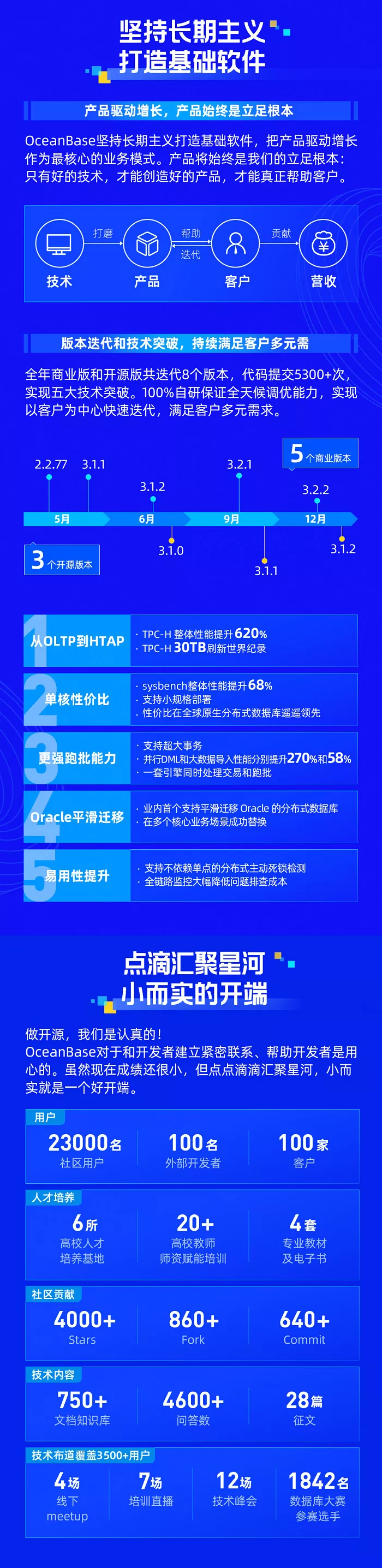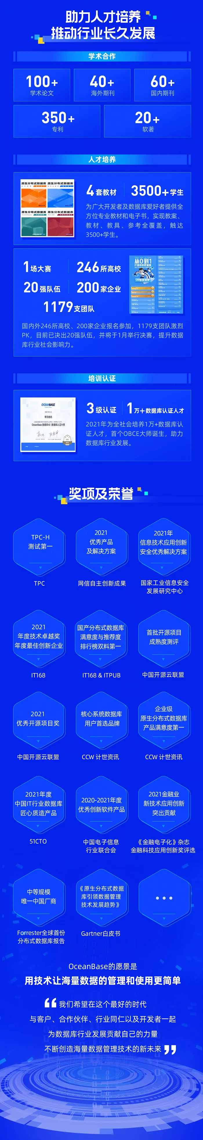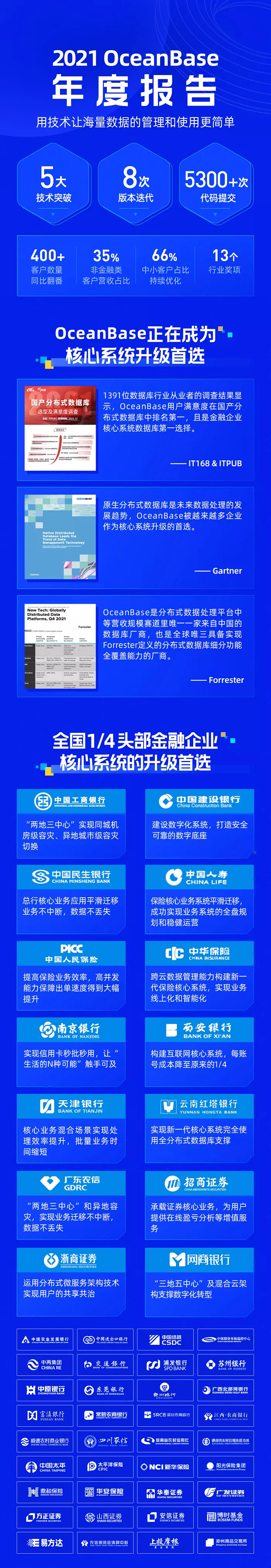 OceanBase 作为一款100%自主研发的国产原生分布式数据库,在技术创新、生态构建、商业推广、开源建设和人才发展等方面迅速发展,雄踞墨天轮2021年度中国数据库魔力象限领导者。