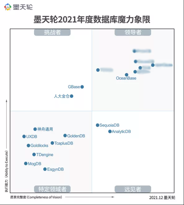 墨天轮选取2021年年度平均分排行前40的数据库产品,通过2021年平均分、最新得分、三方评测(TPC-C、TPC-DS、TPC-H、大数据产品能力以及电信行业能力)、生态(社区平台、高校合作、培训认证、开放文档、代码开源、介质下载)以及论文和专利数量综合评定,同时参考了该数据库在 Gartner 全球云数据库魔力象限的表现以及 IDC 全球数据库市场份额报告。最后将数据汇总到两个维度上 — Ability to Execute(执行层面,即当前产品、服务、销售等表现)和 Completeness of Vision (战略层面,即未来愿景的清晰完整性),根据各家供应商们的表现,将其划分入如下四个象限中,分别为:领导者、远见者、挑战者和特定领域者。