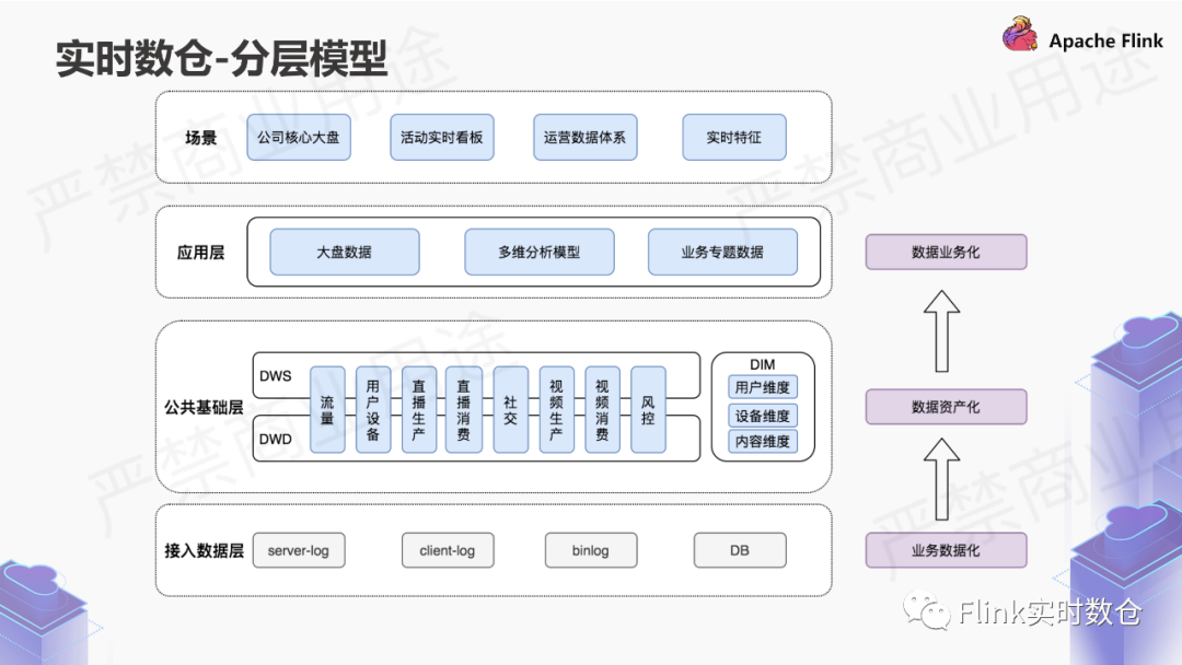 公共基础层做了两层,dwd(明细数据)和wds(公共聚合数据),dim层就是常说的维度。在这个层级上做主题与分层:流量、用户设备、直播生产、指标消费、社交、视频生产、视频消费、风控等等