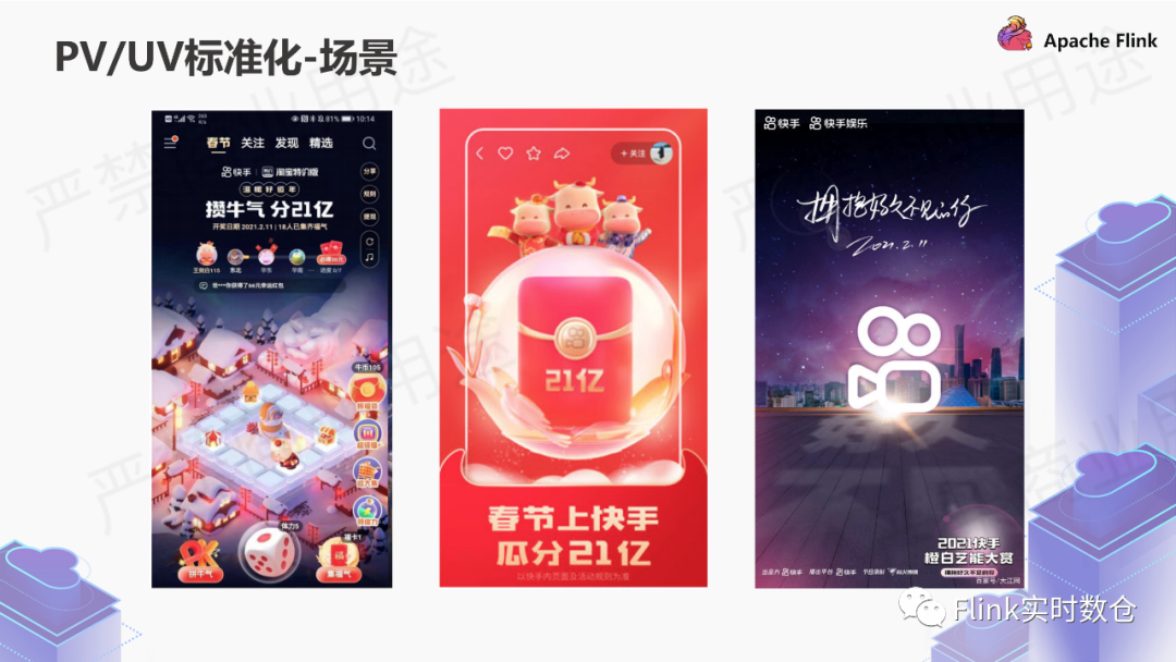 下面是快手的春晚应用场景,主要是统计每个页面来了多少人,某个挂件点击了多少人,曝光了多少人。
