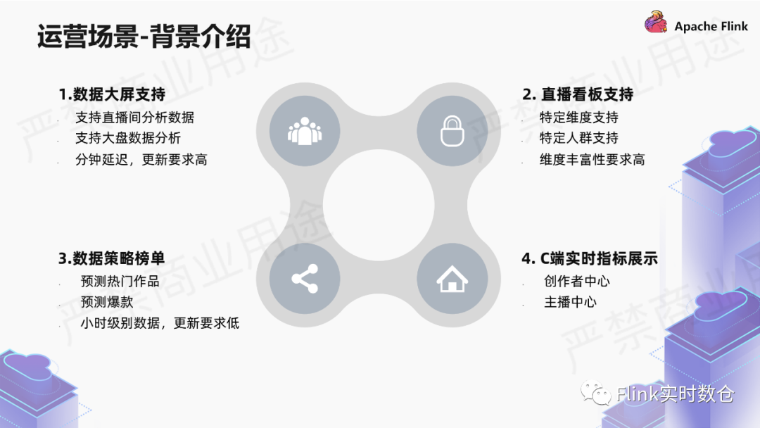 运营数据体系:主要是包括两块,创作者和内容,比如我上线了一个大v的活动,我非常想看到这个直播间的现状以及这个直播间对大盘的牵引情况,还有一个运营的策略调整。