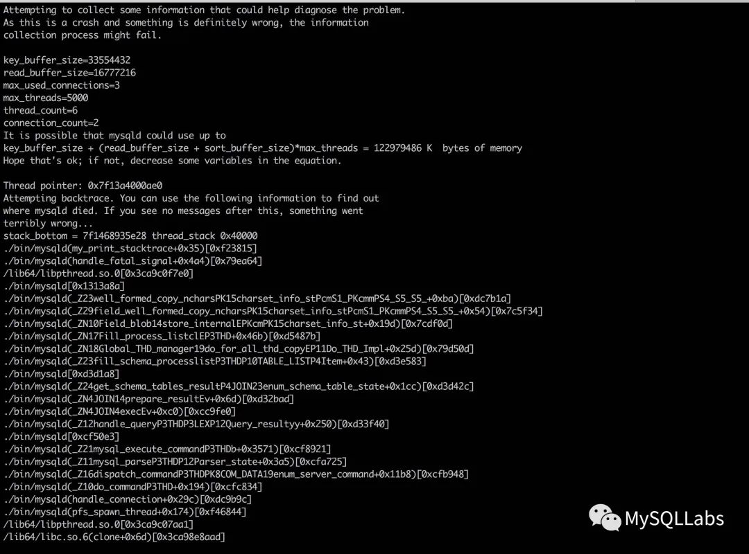 根据操作人员的反馈,只有slave实例可能会出现这个问题,master没有出现过。从日志内容可以看出,触发crash的线程不是IO或者SQL线程,而是外部的某个请求,因为复制线程有相对特殊的函数调用。mysql通过信号捕获机制让它在出现某些异常时,可以将相应的触发crash的线程栈记录到错误日志中,实现机制可以阅读函数void my_init_signals()