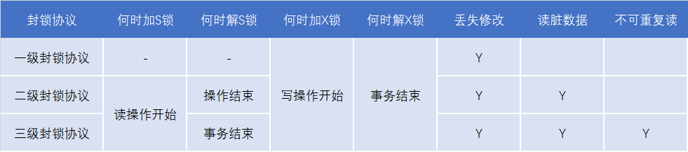 三级封锁协议的异同及效果对比见下表: