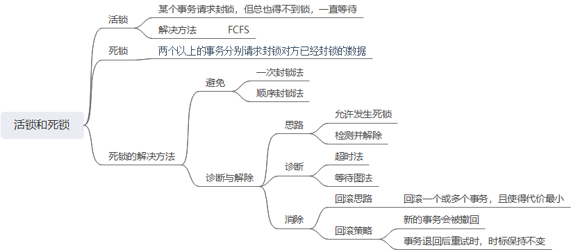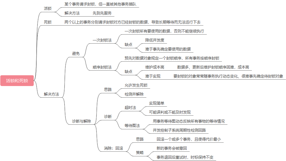 活锁:某个事务请求封锁,但一直被其他事务插队,解决方法是先到先服务