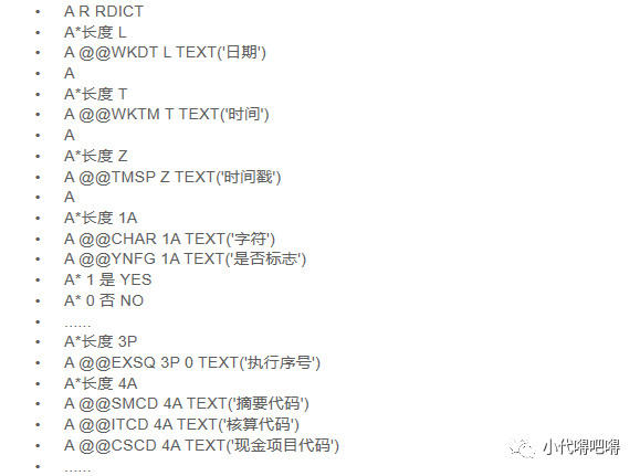 数据字典的实现方式,是建立一个DICT的PF文件并编译,里面的内容即是所有基础类型的定义。摘录部分如下所示。
