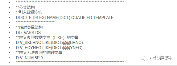 先是D段定义了DICT,引入外部PF结构DICT,并且是QUALIFIED限定为以点访问字段,TEMPLATE指明只声明不分配空间,然后定义变量时就可以用LIKE了。