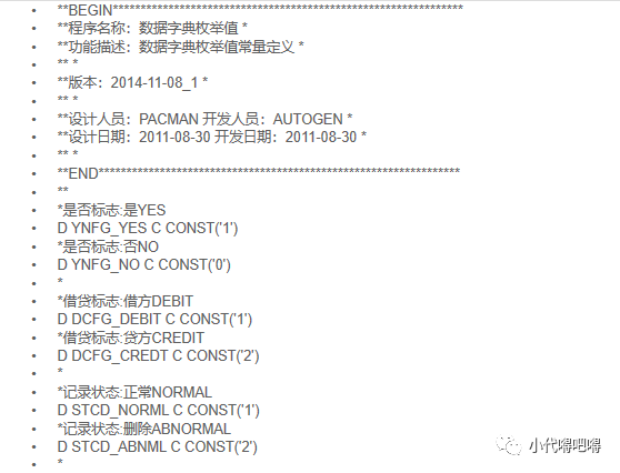 数据字典除了定义了字段类型长度,还对枚举项列表进行了管理。比如数据字典例子中,@@YNFG就是一个枚举,1表示是,0表示否。在尾箱主表的EQYNFG碰平标志就是用了这个枚举。