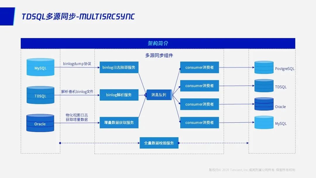 TDSQL多源同步(TDSQL-MULTISRCSYNC),是高性能、高一致,支持多种异构数据平台的数据分发服务。该服务支持以TDSQL作为源端的数据实时同步分发至MySQL、Oracle、PostgreSQL、消息队列等平台,同时也支持以TDSQL作为目标端,将MySQL或者Oracle的数据实时同步至TDSQL中,并且部署灵活,支持一对多,多对一等多种复制拓扑结构。